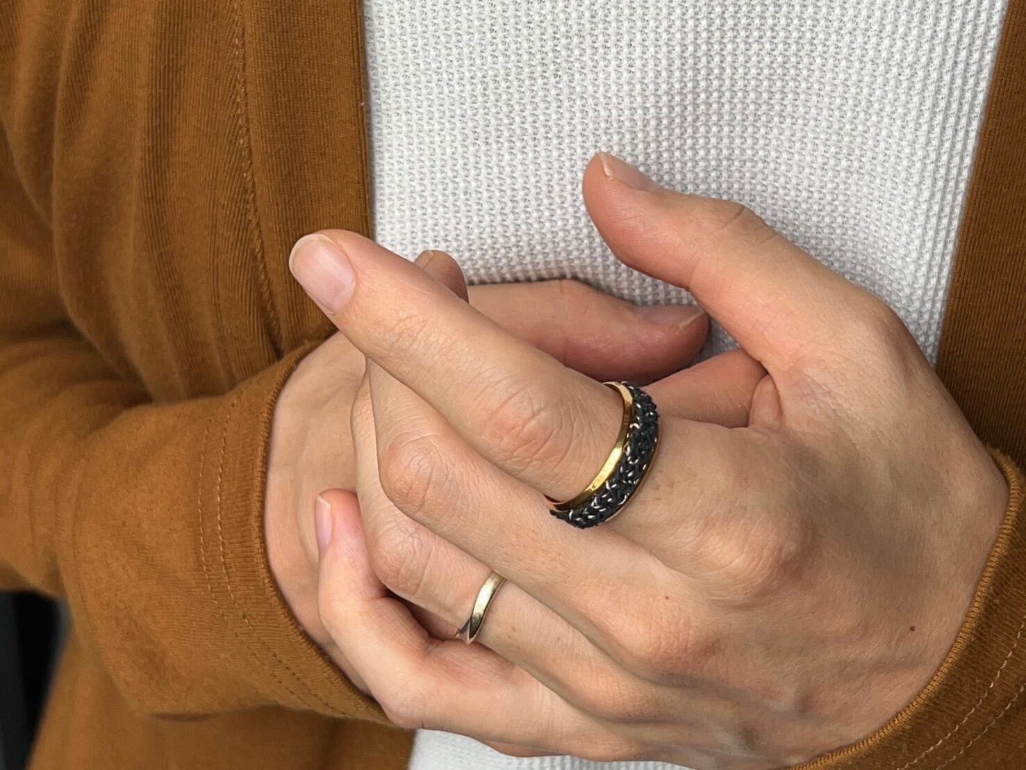 組ひも部分は銀糸を混ぜリングと溶け合うよう仕立てました。リングはステンレススチール製のため耐久性が高くファッショナブル。様々な服にも合わせやすいのが特徴です。